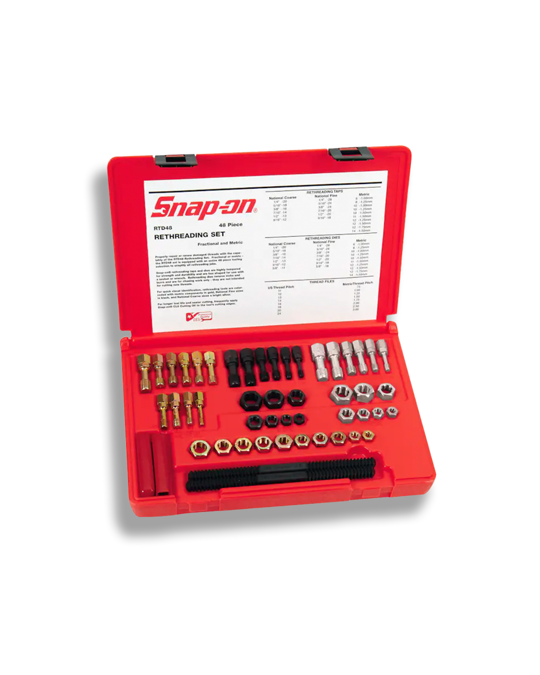 • Incluye machos, terrajas y limas restauradoras de roscas en un estuche.